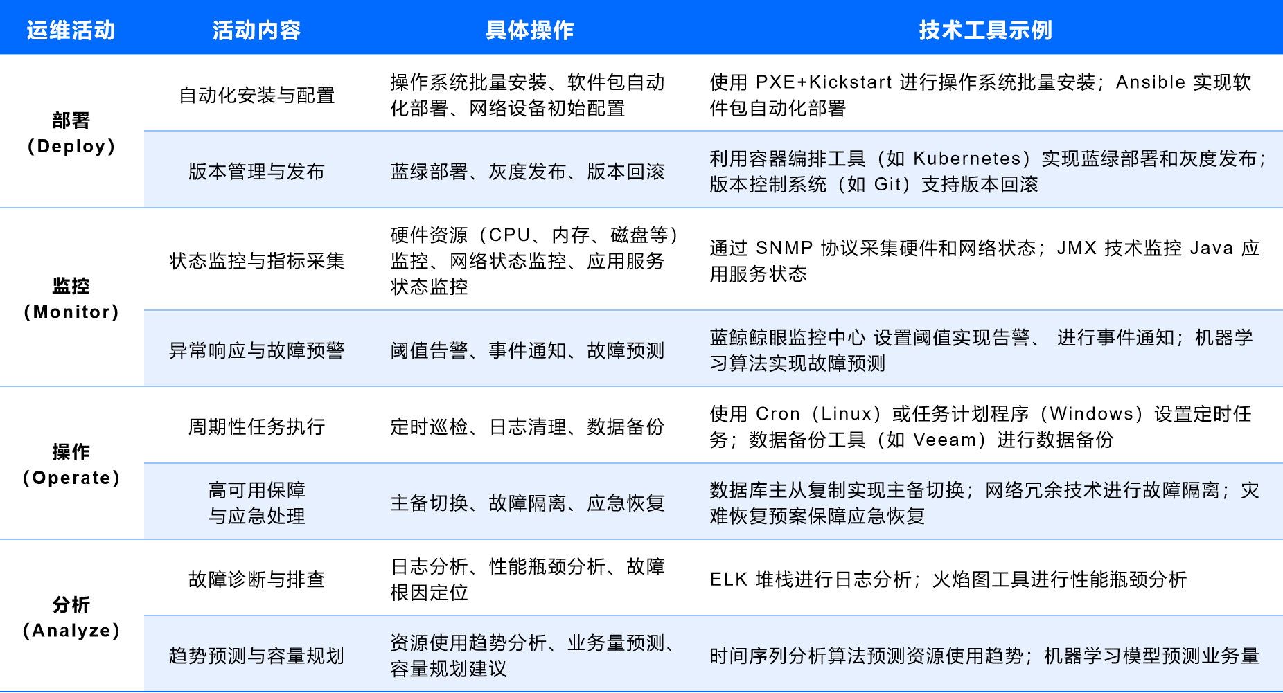 OASR模型中的运维活动由部署(Deploy)、监控(Monitor)、操作(Operate)、分析(Analyze)四大类构成,它们相互关联,共同推动自动化运维的有序进行。以下表格对各类运维活动进行详细阐述: