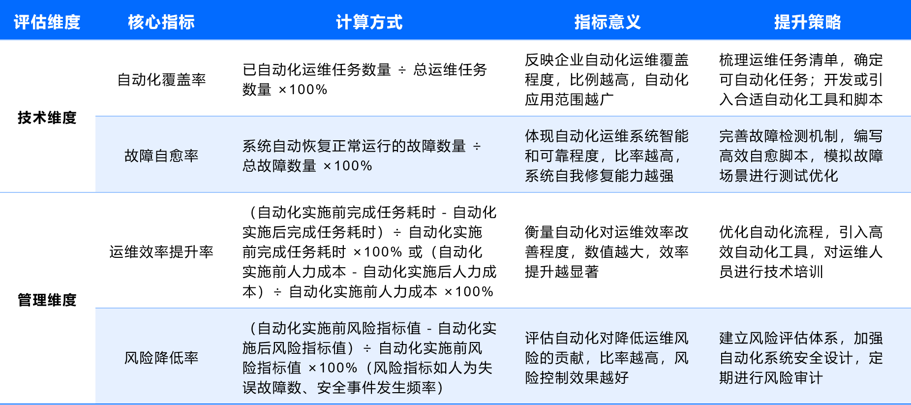 为精准衡量自动化运维能力发展水平,从技术和管理维度选取核心指标进行评估,这些指标反映实际效果并指引改进方向。
