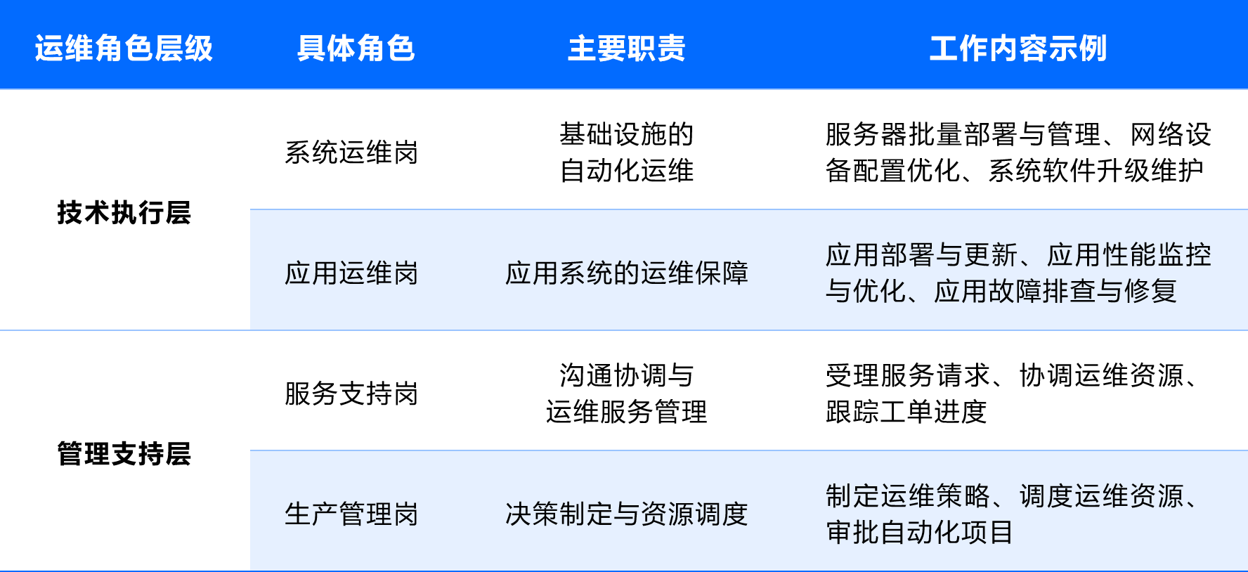 在OASR模型中,运维角色分为技术执行层和管理支持层,各角色明确分工、协同合作。以下表格详细介绍不同运维角色的职责和工作内容: