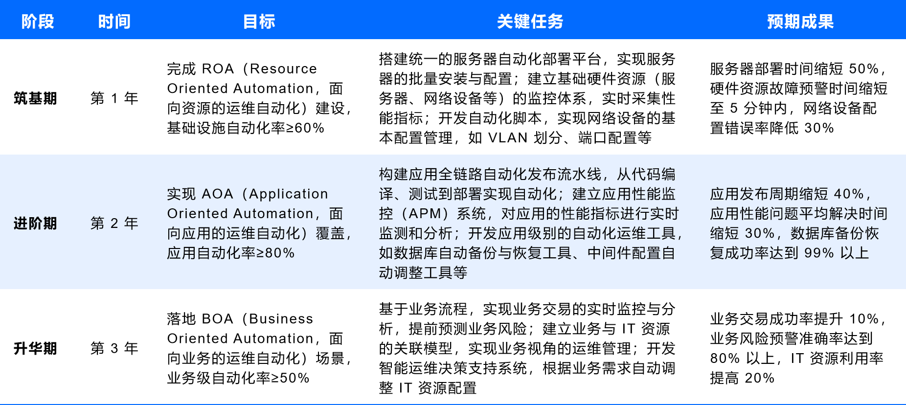 基于上述原则和组织文化适配,制定合理的实施路线图是确保自动化运维规划落地的关键。以下是一个三年的自动化运维实施路线图示例: