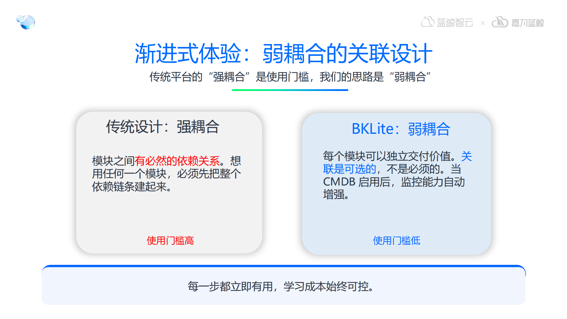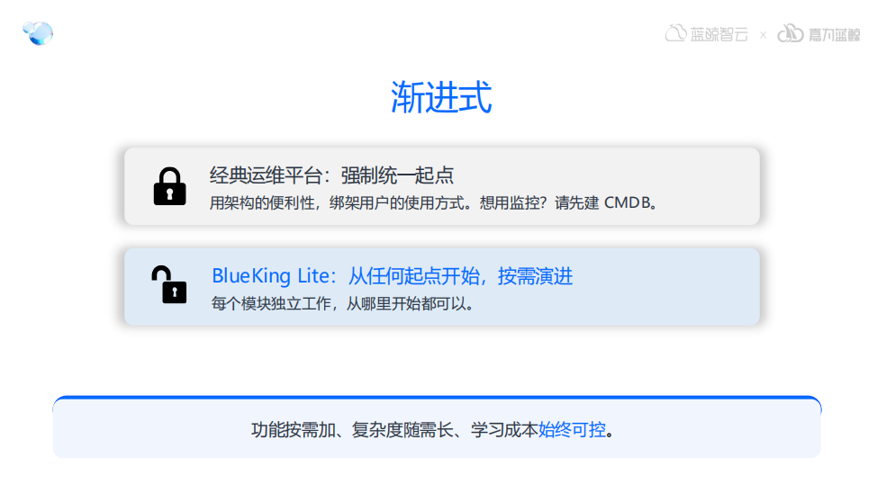 BlueKing Lite的做法是:每个模块独⽴⼯作,从哪⾥开始都可以,按需演进。