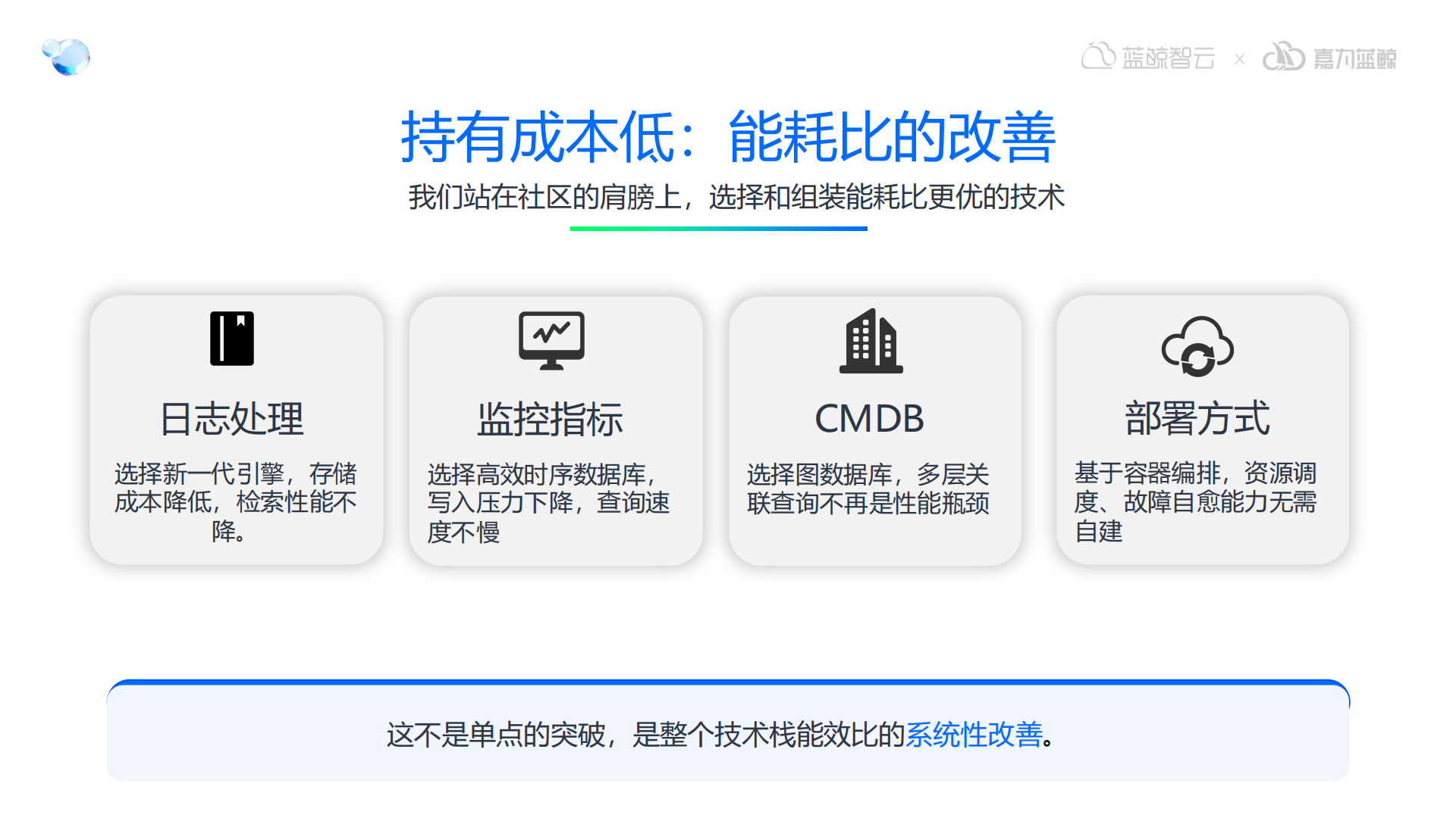 具体来说,日志处理选择新一代引擎,在保持检索性能的同时降低存储成本;监控指标选择⾼效时序数据库,保证查询速度的同时降低写⼊压⼒;CMDB选择图数据库,多层关联查询不再是性能瓶颈;部署⽅式基于容器编排,资源调度、故障⾃愈能力无需自建。