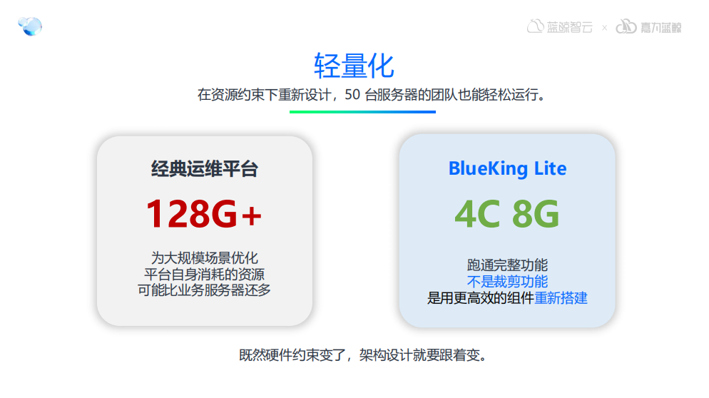 而BlueKing Lite 能够将自身资源占用大幅优化至4核CPU和8GB内存的水平。这并非通过“裁剪功能”实现,而是秉持“既然硬件约束变了,架构设计就要跟着变”的理念,通过选用和重新搭建更⾼效的组件,降低资源占用的同时,依然能够跑通完整的运维功能。