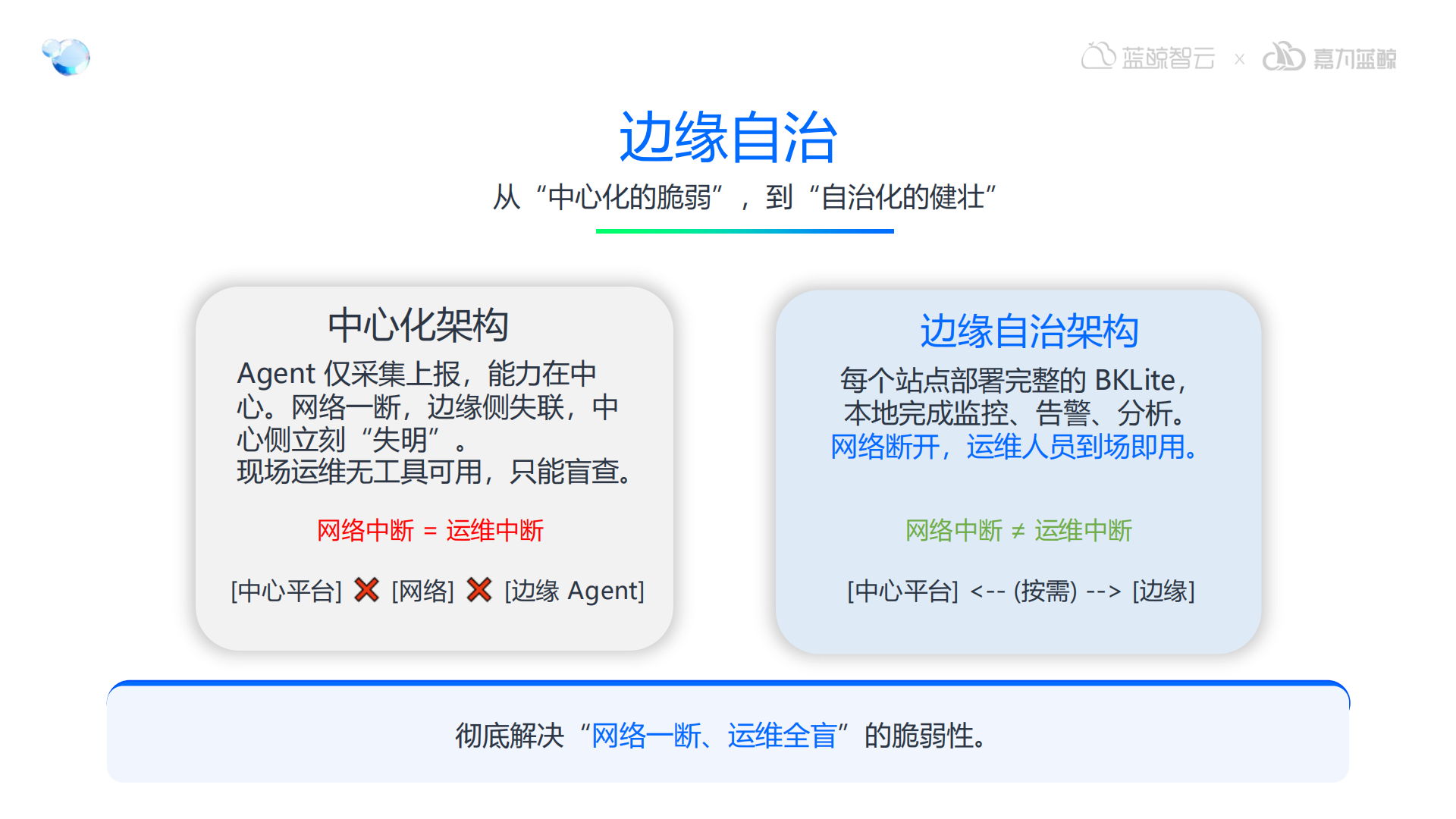在传统的中心化运维架构中,边缘侧Agent的职责仅限于数据采集与上报,核心处理能力高度集中于中心端。这种模式在网络状况良好时尚能支撑,一旦遭遇网络中断,整个运维链条就断了。现场没有分析工具,运维无工具可用,只能靠经验盲查,出现“网络中断=运维中断”的恶性循环。这就是中⼼化架构的脆弱性:边缘侧没有独⽴的运维能⼒。