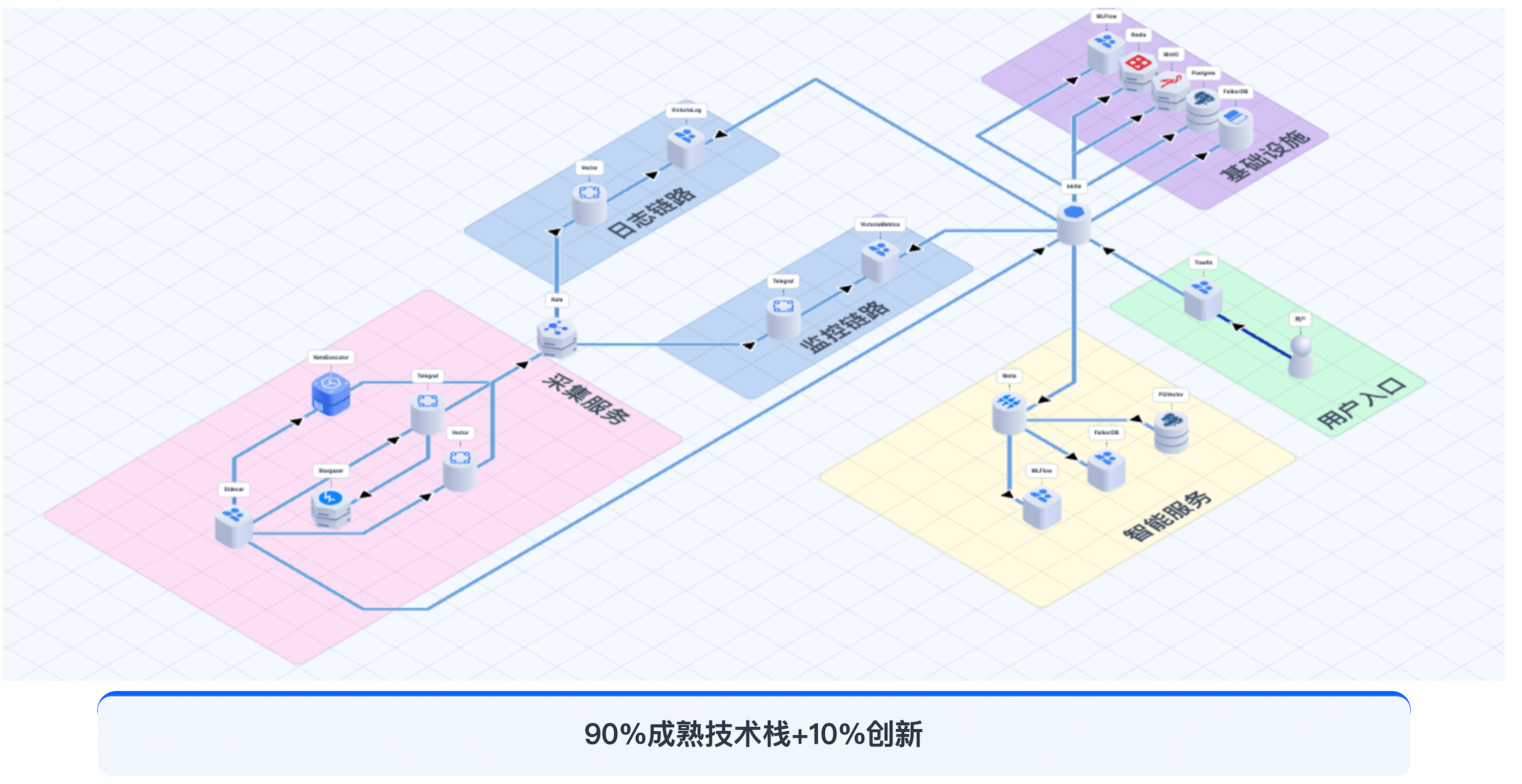 针对上述痛点,吴文豪介绍了 BKLite 轻量级运维平台的设计思路与核心特性:以“轻量化、渐变式、AI First”为核心价值主张,搭配边缘自治与生态开放特性。在技术实现上,平台90%基于成熟技术栈,核心创新在于针对小规模场景的架构优化与AI适配设计。